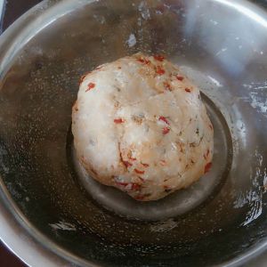 从最下面的那个面片开始卷起。卷好后,来回搓几次,使每个面片之间的空气排出,粘合牢