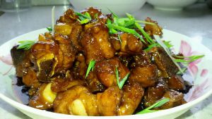 待锅内水快煮干时,一定不能全干,会糊。加入老抽和醋,不断翻炒,直至红糖熬成浆,排骨上色即可出锅。出锅后可洒少许葱花好看些。