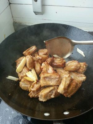 锅中放少许油,下入排骨和大蒜炒一下后,放料酒,少许盐,再加大概100毫升水,加红糖一起炖。