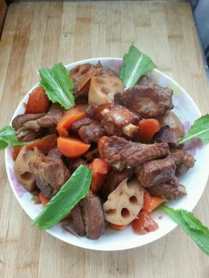加水没过排骨文火炖一个半小时,PS高压锅15分钟,有老人吃20分钟,排骨快熟时加入自己喜欢的蔬菜,比如胡萝卜,土豆,藕,这样解了排骨的油腻,菜又有排骨香