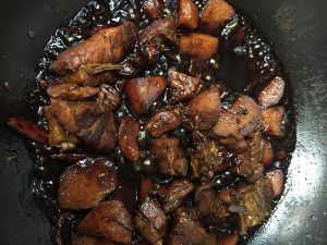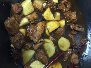 感觉肉差不多了,加入切成块的土豆,这时的汤汁不能太少,否则土豆还没熟,汤汁就干了。继续盖上锅盖烧。