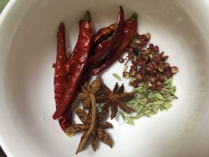 准备佐料,八角、花椒、小茴香、辣椒。吃不了辣就可以不放辣椒。