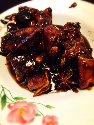 把排骨倒入然后翻炒至每个排骨裹上酱汁,然后倒点水加酱油、盐八角调味,盖上锅盖