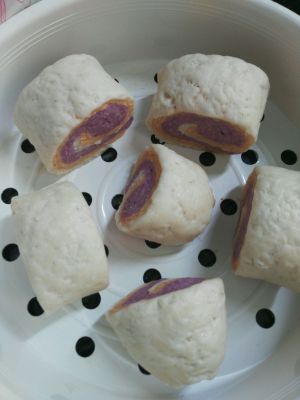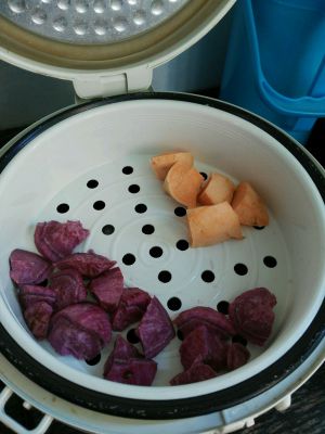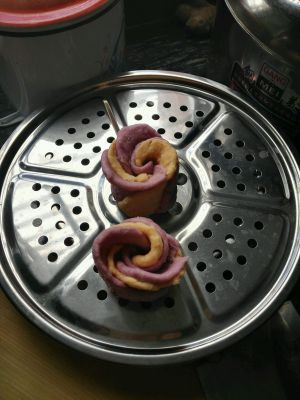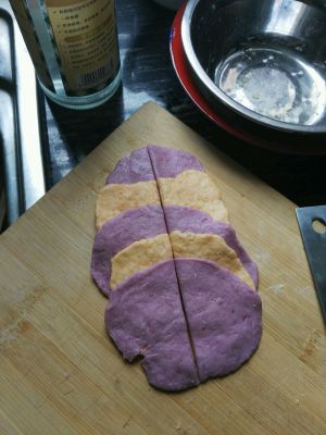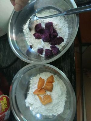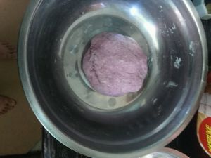分别在面粉中放入红薯紫薯,酵母,还有糖,水揉成面团