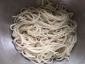 1、先把面条烫个半熟,捞起凉水里过一下,滤干待用