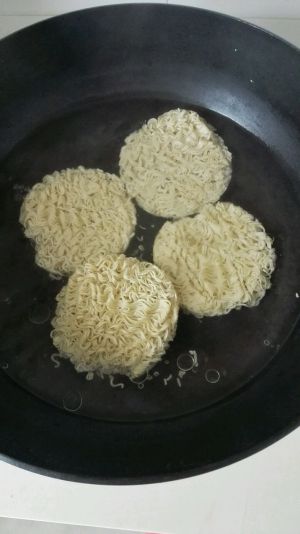 烧水,等水开后下面煮至七八分熟然后捞出到盆中待炒。这个时候最好在盆里放点水,不然待会儿炒的时候会很粘稠。