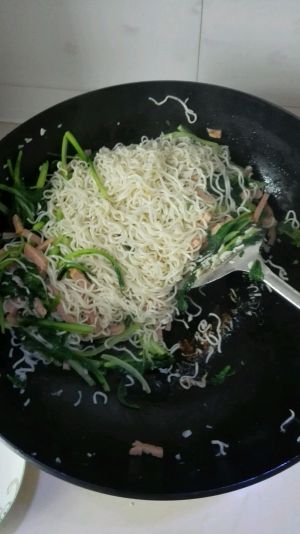 面片事先煮好,捞出来凉水浸泡,根据个人口味,也能不浸泡,放入菜锅里翻炒