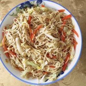 锅热添油,把所有蔬菜一起放入锅中,依次加入五香粉,料酒,蚝油,在放入面条翻炒均匀,最后加入盐,鸡精,味精,酱油,香油即可,成品出锅……