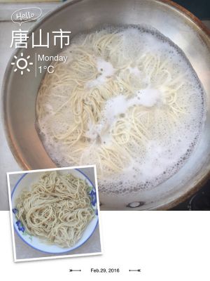 冷水烧开,下入适量面条,八分熟即可,盛出待用……