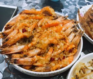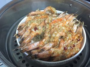 油,5,6成热到入将切好的大蒜(油太热容易糊)爆香一下下,然后放到每个虾的肉肉上
