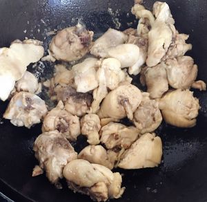 先将姜切丝,干辣椒切段,炒香,倒入切洗好的鸡腿翻炒加入盐,烧出油后加入鸡精,老抽,胡椒烧至上色。