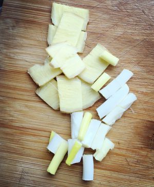 将鸡腿切几刀(方便入味),然后放水里焯一下,加入少量料酒和姜,去腥