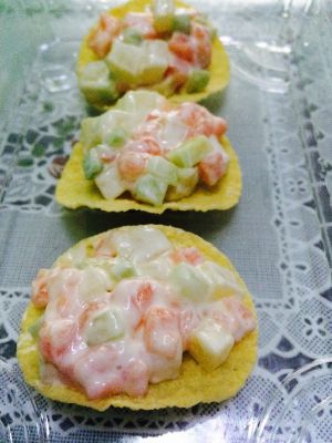 取整片完整薯片,将拌好的食材放入,找漂亮的盘子摆盘。
