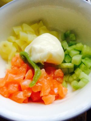三文鱼,土豆,黄瓜全部切丁。用量基本是各三分之一,可根据个人喜好调配。 土豆清水中煮熟,捞出,沥干晾凉。 放入色拉酱和少量芥末酱,当然口味重的可以多放点芥末。 与上面三种食材拌匀。