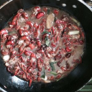 锅里放水,放葱姜花椒粒,放入龙虾尾,煮五六分钟
