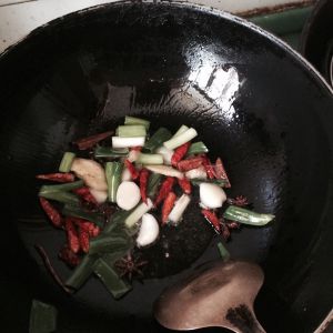 管理啊,多放点油,放入葱段香叶,大料辣椒,花椒,把它炸香