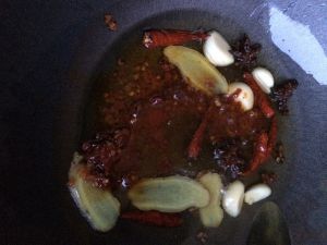 坐锅下油,比平时炒菜多点油! 下各种香料和豆瓣酱,煸出香味,煸出红油