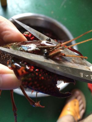 蒜拍一下,姜切片,葱切段,龙虾拿牙刷刷干净,捏着虾背的地方,把尾巴中间那一片尾叶旋转式抽出虾线