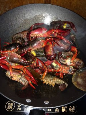 锅里放一点油,倒入一袋火锅料,烧香后倒入龙虾翻炒,倒入一碗水焖10分钟。