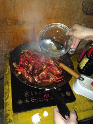 倒入小龙虾翻炒均匀,倒入半瓶啤酒,适量清水。