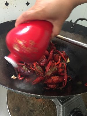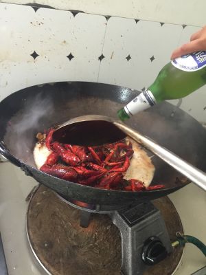 锅里留少许油,放干辣椒花椒粒煸出香味,《约4|5秒》随后加葱姜蒜 。、煸2、3秒。加入炸好的小龙虾。加盐适量,胡椒粉,料酒适量。翻炒五六秒。加半瓶啤酒,适量水。