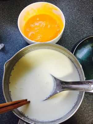 细砂糖放入稀释,蛋黄备用,等奶液完全冷却再放入蛋黄搅拌均匀