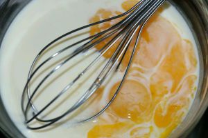 把淡奶油,鸡蛋,牛奶,糖放在一起搅拌,直到糖充分融化。