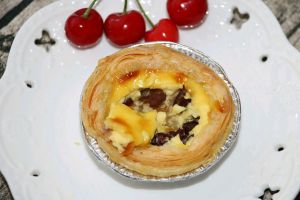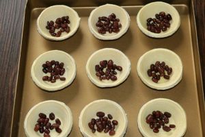 冷冻的蛋挞皮提前拿出来解冻,或者微波炉叮20秒,挞底放入适量红豆!
