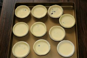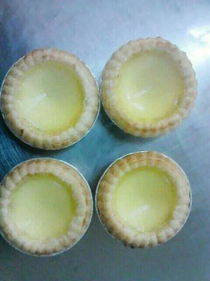 将做好的蛋挞液倒入挞皮中,不要太满,7分就可以,以免漏出来。
