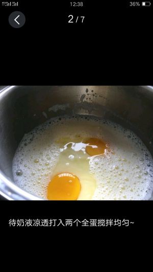 加入蛋黄(加入蛋黄时必须确定液体事凉的,防止烫熟蛋黄),用手动打蛋器搅拌均匀。