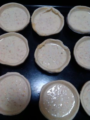 做好的蛋挞液倒入挞皮里,装到八分满。