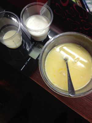 这时可以做挞水,把蛋液、牛奶和糖混合均匀再过筛就行了。你们那么聪明,我就不上图了。