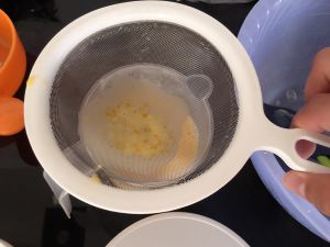 冷却后,加入蛋黄、粉,搅拌均匀(我是想把奶油用完,做了24个的份量),如果粉搅拌不是很均匀,可以过滤一下,滤网上的用勺子碾压一下