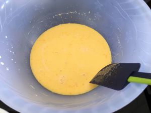 蛋黄搅拌均匀加入冷却的混合液,搅拌均匀,筛入吉士粉搅拌均匀