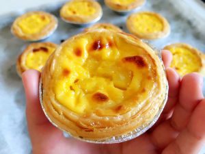 出锅,摆盘。盘子一定要美美哒 这是上次做的成果,火候比这次做的大一点。可以在中途看一下蛋挞的情况,适时调整上下火,温度和时间。烘焙本来就是diy的事情,每做一次都会有不同的创造,相信自己!