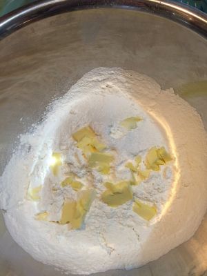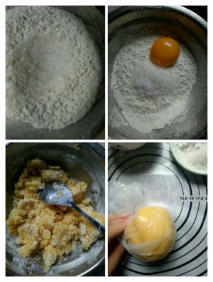100克低粉筛盆里,一克盐,蛋黄和液化黄油加进去搅拌,放进保鲜袋揉成团,放冰箱冷藏30分钟