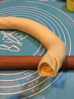 第十五步:最后一下拿出面团,擀成0.3cm的面皮,把面皮卷起来,如图所示。