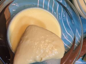 牛奶+淡奶油+细砂糖搅拌溶化、鸡蛋搅均
