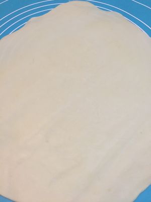 第九步:把松弛好的面皮从冰箱拿出来,擀成薄面皮,如图所示。