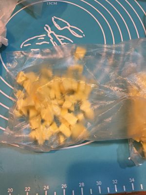 第七步:把黄油切小块,用擀面杖擀成黄油薄片(切小块是方便擀,因为黄油不太好擀开)