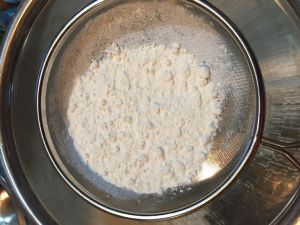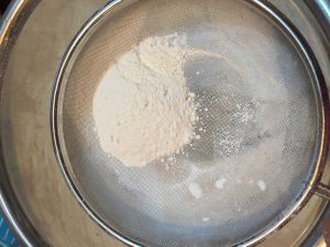 加入打散的蛋黄搅拌均匀,过筛面粉倒入用橡胶刀搅拌均匀,最后蛋酱再过筛一遍,这样口感会更细滑。