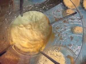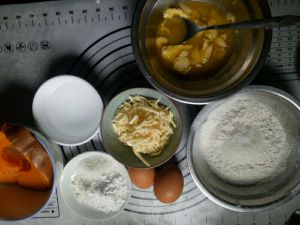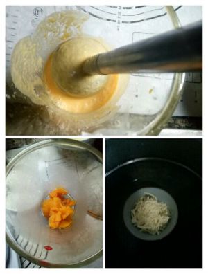 把100克熟南瓜,加水,白砂糖,低粉,玉米淀粉,鸡蛋,奶酪,用料理棒打碎。