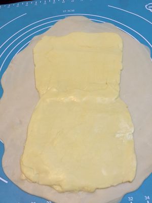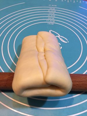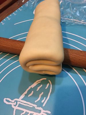 第十三步:把第一次冷藏或冷冻好的面团拿出来擀成薄面皮,然后向叠被子一样叠好再次放入冰箱冷藏或者冷冻,重复这样的步骤三次。