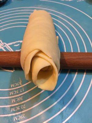 第十四步:叠完三次,拿出面皮擀成薄面皮,卷起来,如图所示,再次放入冰箱冷藏25分钟或者冷冻7-8分钟。