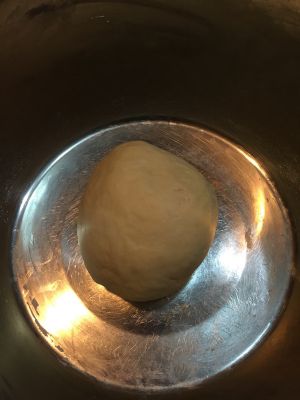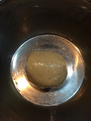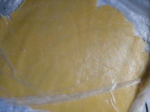 第六步:把揉好的面团包上保鲜膜放入冰箱冷藏室醒30分钟(包上保鲜膜是为了防止风干,静置面条是为了松弛面团,冷藏是防止黄油融化)