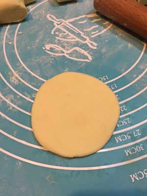 第十七步:将一个小剂子从中间压平,用擀面杖擀成小面皮,备用。