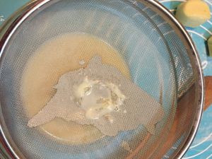 第二十三步:把蛋挞液过筛,这样蛋挞馅会更细腻。