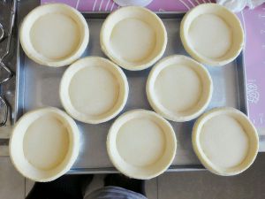 将蛋挞液倒入提前解冻的蛋挞皮中,积分满即可。每个蛋挞上面再放三颗蓝莓。