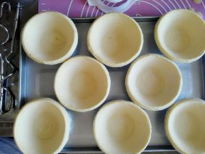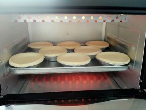 把蛋挞送入预热好的烤箱,上下管220度,烤盘放中层烤25~30分钟至表面金黄。