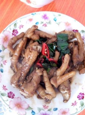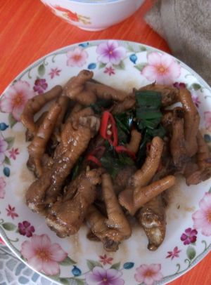 热锅放油,放辣椒。蒜苗,放鸡爪。后放酱油,翻炒。颜色均匀可盛出。